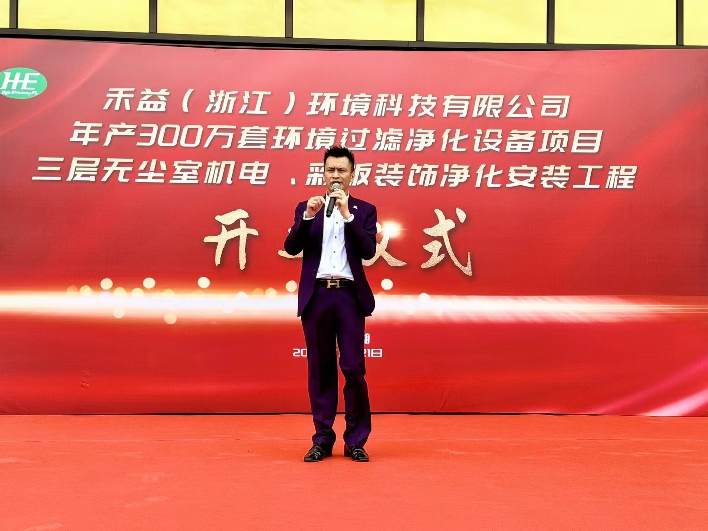 在熱烈的氛圍中,主持人登臺介紹來賓,并邀請禾益集團總經理陳滿意上臺致辭。他表示,禾益集團自成立以來,一直致力于凈化設備制造技術的研發與創新,此次項目的開工是公司發展歷程中一個重要的里程碑。通過建立技術研發中心,禾益集團將擁有更強大的創新力量和技術優勢。